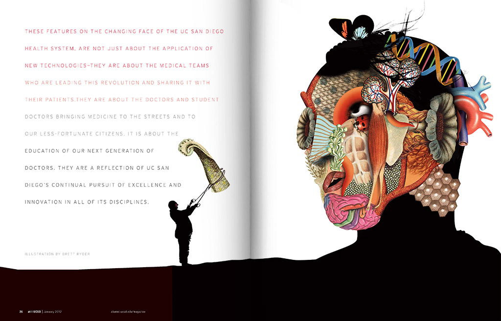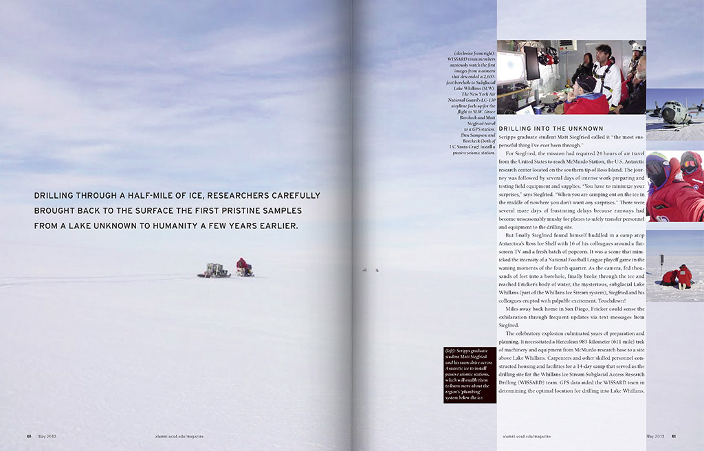 Produced and published quarterly, the Triton magazine highlights the achievements of UC San Diego graduates, students and faculty. Known for their scientific achievements and dedication to the arts, the magazine reflects the modern graphics and design that illuminate the stories.